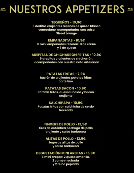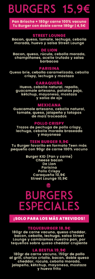 180gr de carne vacuno, queso cheddar, cebolla, lechuga, salsa Street Lounge y cambiamos el pan por tequeños ¡ÚNICA Y ORIGINAL!